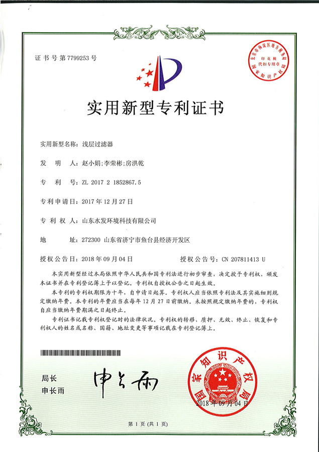 近日,山東水發(fā)環(huán)境科技有限公司申報(bào)的“淺層過(guò)濾器”獲國(guó)家實(shí)用新型專利證書(shū)。
