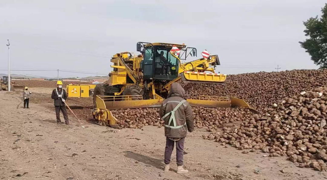 ▲內(nèi)蒙古佰惠生公司將甜菜從地頭拉回公司的堆場后進行堆垛,圖中的羅霸機正在進行甜菜的堆垛工作。